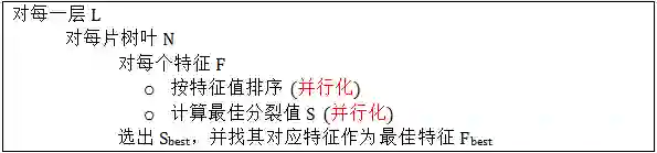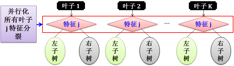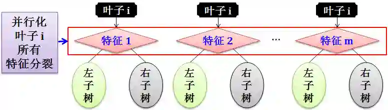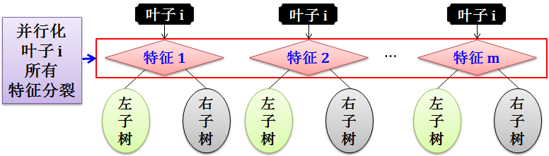 在某片叶子要进行分裂时,对 m 个特征进行并行化计算出最佳分裂值 S,比较所有 S 选出最佳中的最佳。
