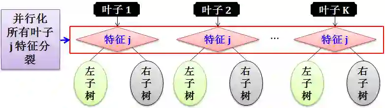这种并行方式比第一种好,但当树越来越深时,每片叶子包含的样例会越来越少,这种并行化带来的优势也越来越小。