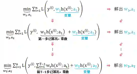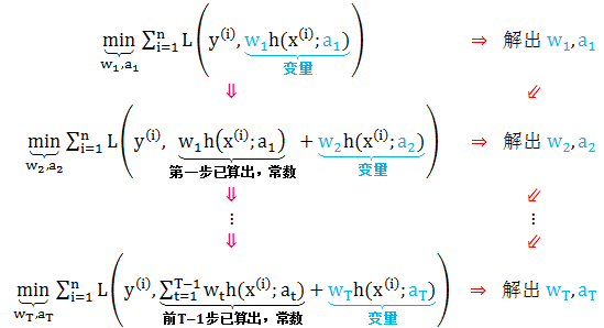 通常一次性优化解出 wt 和 at 是很复杂的,我们现在思路是如果从 t 等于 1 到 T,每一步只学习一个基函数和其系数,逐步逼近上面的函数式,从而简化了优化的复杂度。具体优化步骤如下: