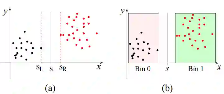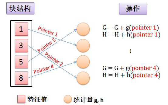 从小节 3.2 的算法 2 可知,在树分裂前每个特征的特征值都需要排序,而这个步骤是非常耗时的。为了减低排序用时,可将数据存在存储单元 (in-memory unit),又叫块 (block)。在每块中,数据是以压缩柱 (compressed column) 形式存储;而在每个柱状中,数据按特征值大小来排序。