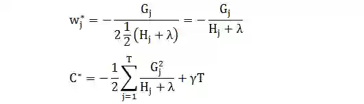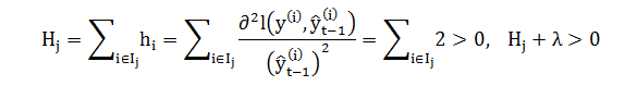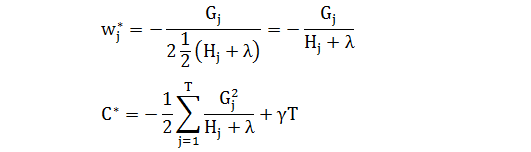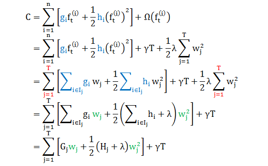 在求解 gi 和 hi 时按照叶子整合 (而不是按照数据整合) 更简单些,接着上面的推导 (将 J 看成是 f 的函数,因此l可看成常数项而拿掉),根据小节1.3 里面 f(x) 和 q(x) 的定义