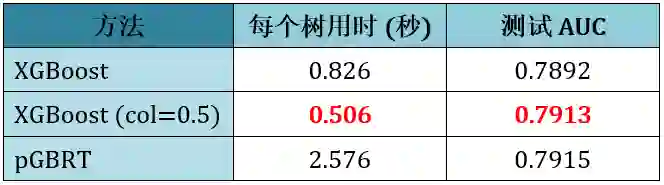 XGBoost 列取样一半时和 pGBRT 的 AUC 几乎一样,但是前者速度是后者速度 5 倍