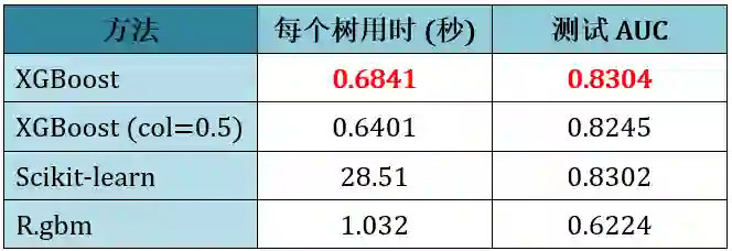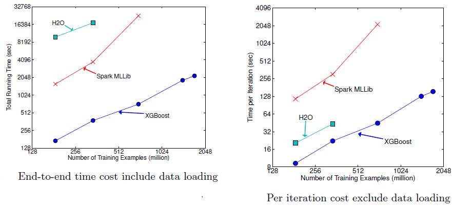H2O大概只能运行到 350M 多个数据,Spark MLLib 大概只能运行到 700M 多个数据,但是 XGBoost 可以运行到 1.7B 个数据