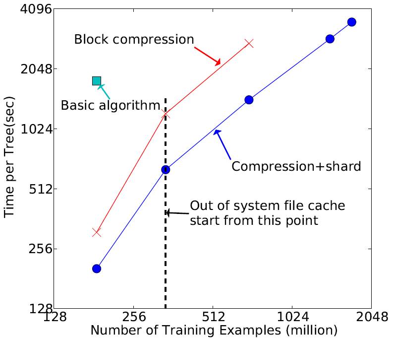 XGBoost 还会充分利用计算机的资源实现可扩展 (scalable) 学习。除了处理器和内存,使用磁盘空间处理内存处理不了的数据能提高效率。启用外核计算 (out-of-core computing),我们将数据分成多个块,将每个块存储在磁盘上。在计算过程中,使用一个独立的线程来预取块主存储器,所以计算和磁盘读取可以同时发生。但是,这并不完全解决问题,因为磁盘阅读需要大部分的计算时间。减少开销很重要并增加磁盘输入输出 (IO) 的吞吐量 (throughput)。主要有两个改进核心外计算的技术: