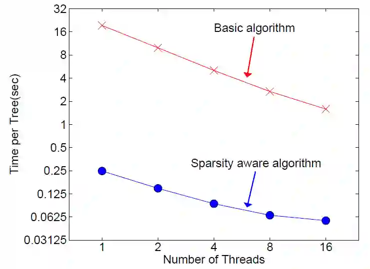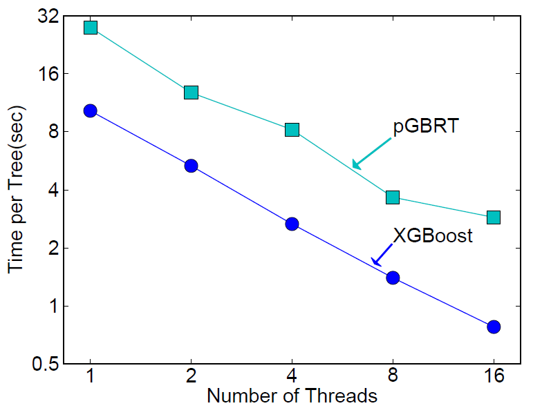 下图也清楚看到在不同线程情况下,XGBoost 都比 pGBRT 运行速度快。