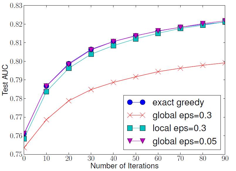 XGBoost 比 pGBRT (业界做排序最强) 得到的 AUC 稍差一些,但是前者速度是后者速度 3 倍