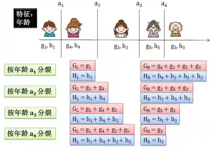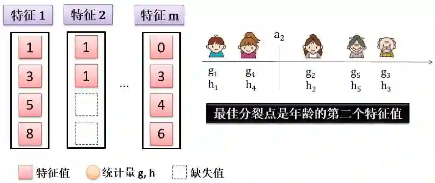 上图将 m 个特征的特征值排序,虚线框代表确实数据不参与排序。经过线性扫描得到年龄里的第二个的特征值 a2 是最佳分裂点。