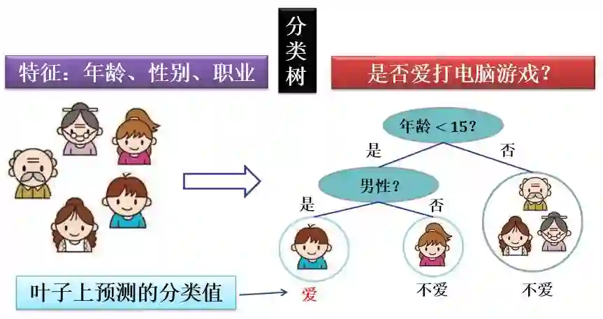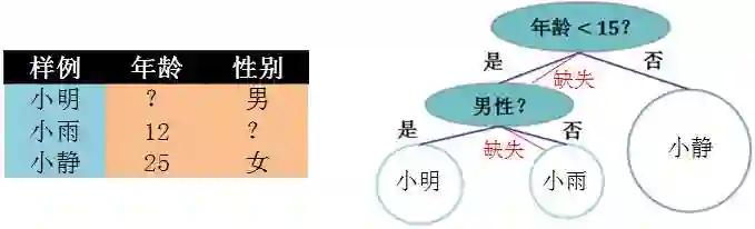 在用年龄分裂时,小明的年龄不详,按照某种规则被分到小于 15 岁;接下来在用性别分裂时,小雨的性别不详,按照某种规则被分到女性。这些规则都是从数据中学来的,比如将小明分到小于 15 岁和大于等于 15 岁,看哪个分类误差小就选哪个。