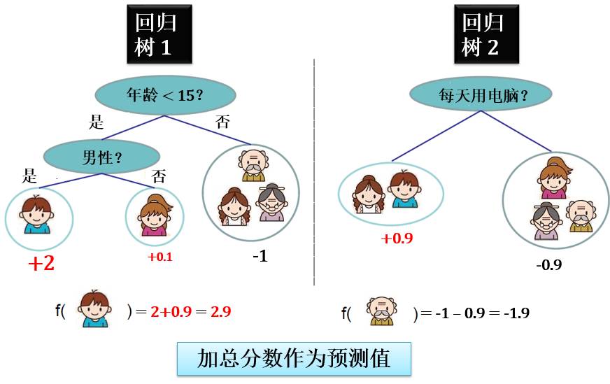 在上面用两棵回归树来预测的例子中。对于每个样本的预测结果就是每棵树预测分数的和。比如在是否爱打电脑游戏这个问题上
