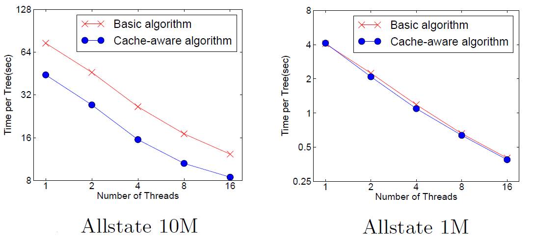 Allstate 是一套关于车保的数据,y 是保险金额,x 包括家庭 ID、车牌、车担保年份、型号等等。用 Allstate 数据集画出了在稀疏算法和缓存优化上的表现。