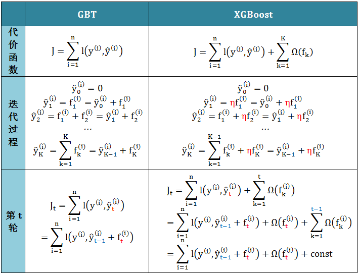 从偏差方差权衡 (bias-variance trade off) 的角度来讲,正则项降低了模型的方差,使学习出来的模型更加简单,防止过拟合,这也是 XGBoost 优于传统 GBT 的一个特性。 和 GBT 一样,XGBoost 也是通过加法模型和前向分布算法来训练模型的,类比如下