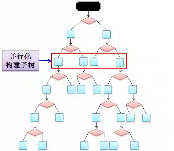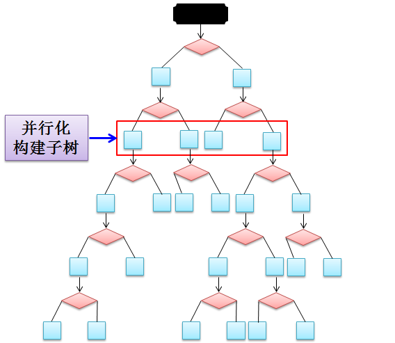 如上图所示,以红框那层 4 片叶子举例,我们并行化构建子树过程。但是这种并行方式有严重的问题,就是工作量失衡 (workload imbalanced)。比如第二和三片的叶子含有的样例就明显小于第一和四片的叶子含有的样例。这样会造成并行时的工作量不均衡,因而并行效率也不高。直接并行构建子树太粗了,我们需要一种更细分的并行化。