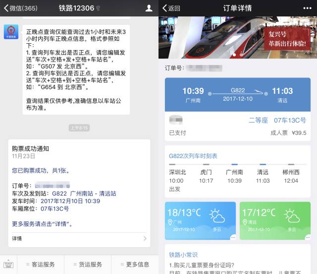 自11月全面支持微信支付购票后,用户可以通过微信接收12306消息通知。