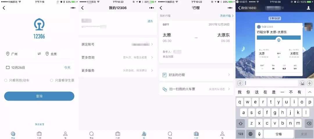 除了能在微信上接收出行信息,“铁路12306”小程序还有扫票查询列车动态信息、查看动态时刻表、余票查询、行程管理、分享好友行程、个人中心等姿势来等你解锁。