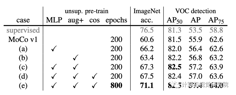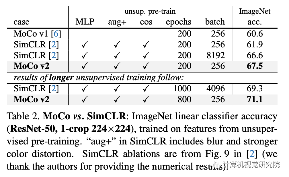 通过在【A simple framework for contrastive learning of visual representations】中加入模糊增强来扩展【Kaiming He, Haoqi Fan, Yuxin Wu, Saining Xie, and RossGirshick. Momentum contrast for unsupervised visual representation learning. arXiv:1911.05722, 2019】中的原始增强处理。单独的额外增加(即(no MLP)将ImageNet上的MoCo基线提高了2.8%,达到63.4%,见下表(b)。