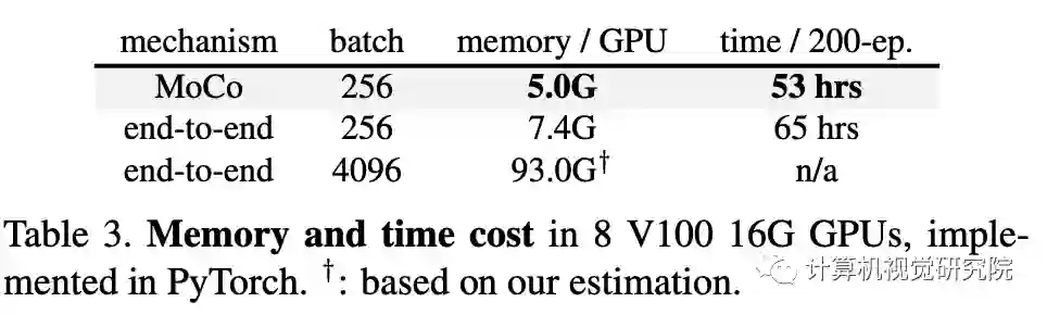 即使在高端的8-GPU机器上,4k的批处理大小也是难以处理的。而且,在相同的批处理大小为256的情况下,端到端变体在内存和时间上仍然更昂贵,因为它向后传播到q和k编码器,而MoCo只向后传播到q编码器。