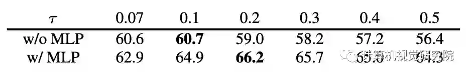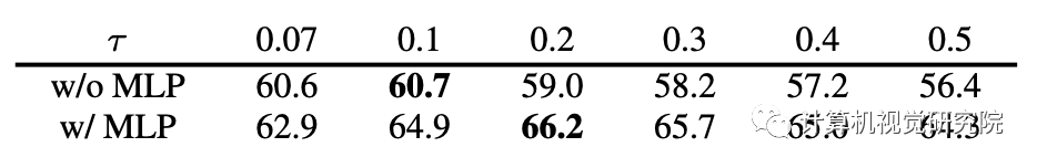 在【Ting Chen, Simon Kornblith, Mohammad Norouzi, and Geoffrey Hinton. A simple framework for contrastive learningof visual representations. arXiv:2002.05709, 2020】之后,将MoCo中的FC Head替换为2层的MLP head。这只影响到非监督训练阶段;线性分类或迁移阶段不使用这个MLP head。【A simple framework for contrastive learning of visual representations】之后寻找一个最佳的τ关于ImageNet线性分类准确率。
