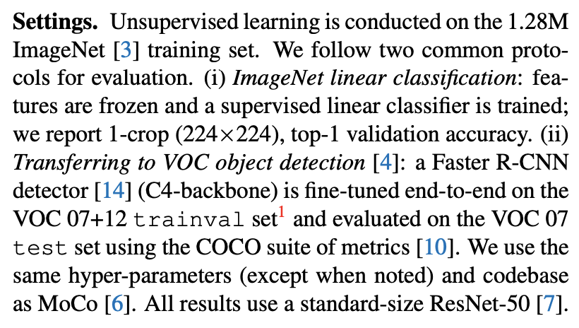 大概意思就是:在ImageNet数据集上进行无监督学习。首先ImageNet线性分类——对特征进行冻结,训练监督线性分类器;然后迁移到VOC目标检测:Faster R-CNN在VOC 07+12训练集上进行端到端微调,在VOC 07测试集上使用MSCOCO的标准进行评估。所有结果使用标准尺寸的ResNet-50网络。