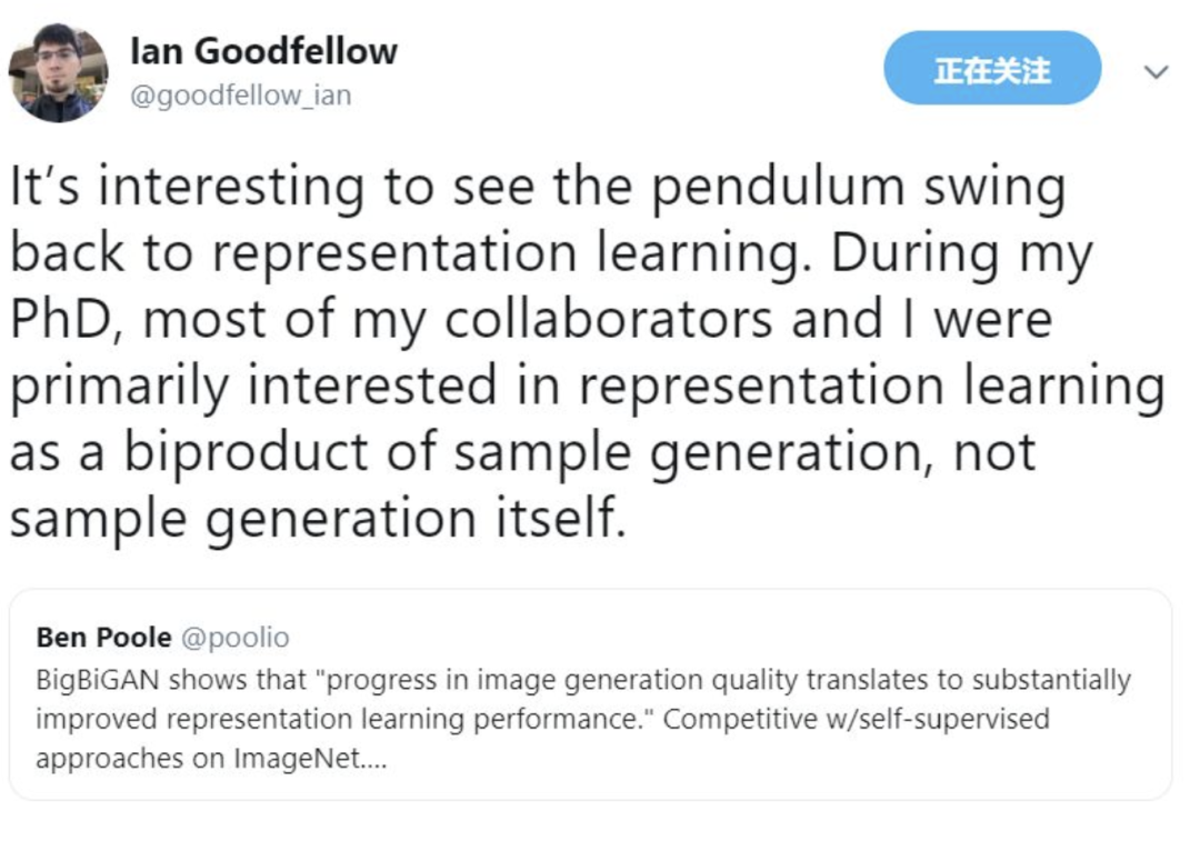 这篇论文在Twitter上引发很大反响。GAN发明人Ian Goodfellow说:“很有趣,又回到了表示学习。我读PhD期间,我和大多数合作者都对作为样本生成的副产品的表示学习很感兴趣,而不是样本生成本身。”