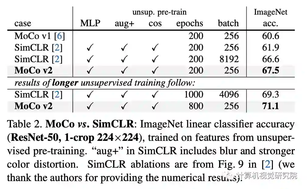 与MoCo和SimCLR框架是正交的,当与MoCo一起使用时,它们会带来更好的图像分类和目标检测迁移学习结果。此外,MoCo框架可以处理大量的负样本,而不需要大量的训练批。与需要TPU支持的SimCLR的4k∼8kbatches相比,“MoCo v2”基线可以在典型的8-GPU机器上运行,并且获得比SimCLR更好的结果。