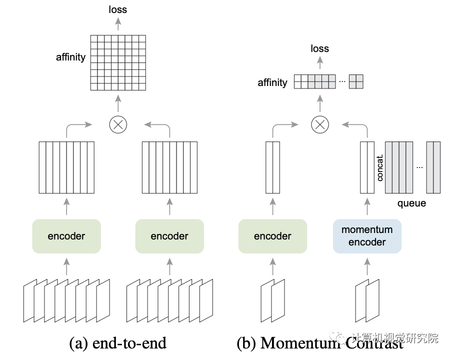 对比损失可以通过不同的机制来最小化,这些机制是key如何被维护。在端到端的机制中(下图a)。negative keys来自同一批,并通过反向传播进行端到端的更新。SimCLR是基于这一机制,需要大批量提供一大组negatives。在MoCo机制中(下图b), 在队列中维护negative keys,每个训练批中只编码queriesand positive keys。采用动量编码器来提高当前和早期keys之间的表示一致性。MoCo将从negatives的数量减少批大小。