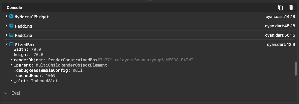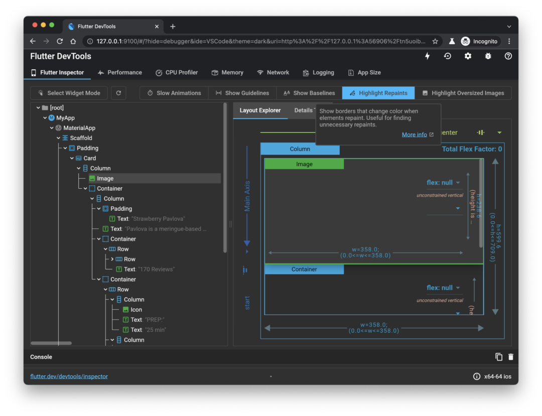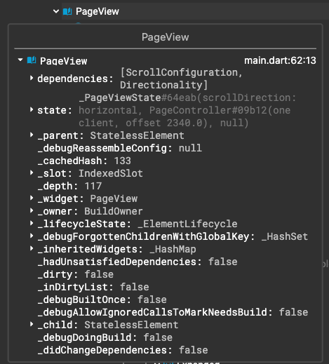 性能并不是您需要调试的唯一方面。此版本的 DevTools 提供了一项 Widget Inspector 更新,当您将鼠标指针悬停在 widget 上,可以评估对象、查看属性、widget 状态等。