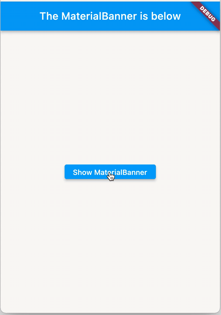 class HomePage extends StatelessWidget {const HomePage({Key? key}) : super(key: key);@overrideWidget build(BuildContext context) => Scaffold(appBar: AppBar(title: const Text('The MaterialBanner is below'),),body: Center(child: ElevatedButton(child: const Text('Show MaterialBanner'),onPressed: () => ScaffoldMessenger.of(context).showMaterialBanner(MaterialBanner(content: const Text('Hello, I am a Material Banner'),leading: const Icon(Icons.info),backgroundColor: Colors.yellow,actions: [TextButton(child: const Text('Dismiss'),onPressed: () => ScaffoldMessenger.of(context).hideCurrentMaterialBanner(),),],),),),),);}