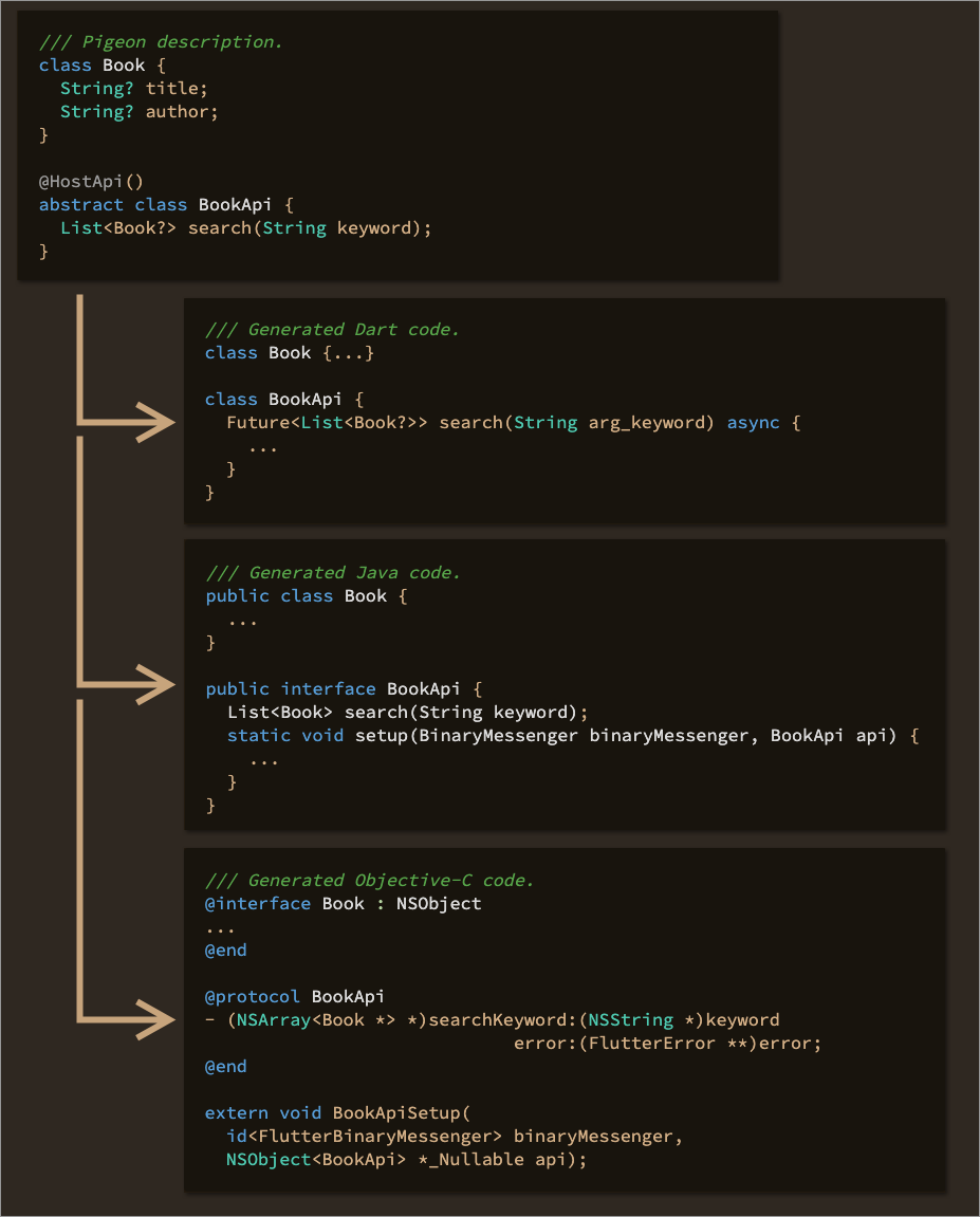 如果您开发的是插件而不是应用,则可能会对 Pigeon 1.0 版本感兴趣。Pigeon 是一个代码生成工具,用于生成 Flutter 及其主机平台之间类型安全的互操作性代码。借助该工具,您可以定义插件 API 的说明,并为 Dart、Java 和 Objective-C 生成框架代码 (分别可用于 Kotlin 和 Swift)。