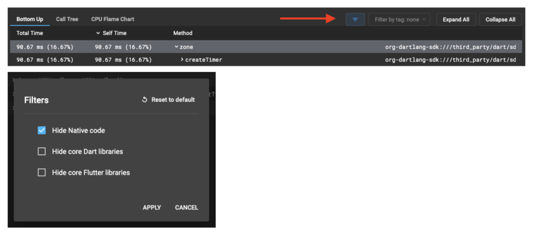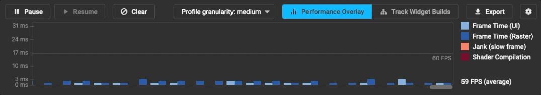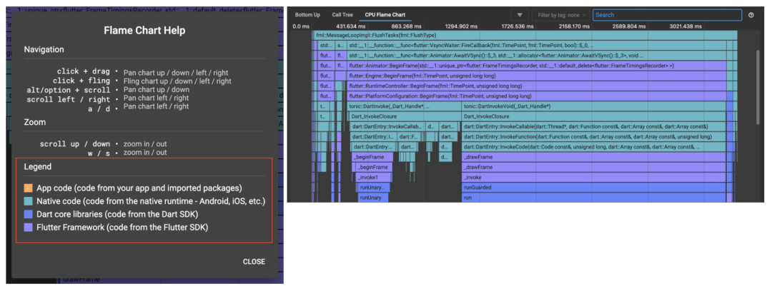 △ 对帧图表进行颜色编码以便区分 app、原生、Dart 以及 Flutter 的编码活动