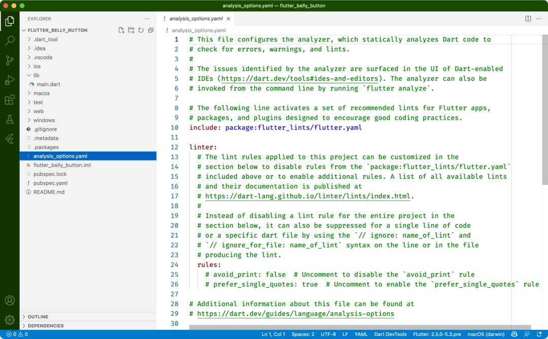 △ 'flutter create' 开箱即有一个 analysis_options.yaml 文件,预先使用了推荐的 Flutter lint