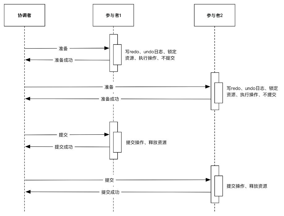 两阶段提交协议将分布式事务分为两个阶段,一个是准备阶段,一个是提交阶段,两个阶段都由事务管理器发起。