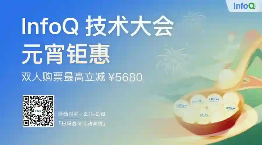 InfoQ 技术大会元宵节限时活动正在进行中。2 月 11-18 日,双人购票即可享受最高立减 5680 元优惠。QCon、ArchSummit、GMTC、PCon、AICon 等 5 大会议品牌、11 场大会,涵盖架构、前端、产品、AI 等方向。不论你是架构师、产品、技术、研发、前端,总有适合你的,扫码下图二维码咨询活动详情吧!