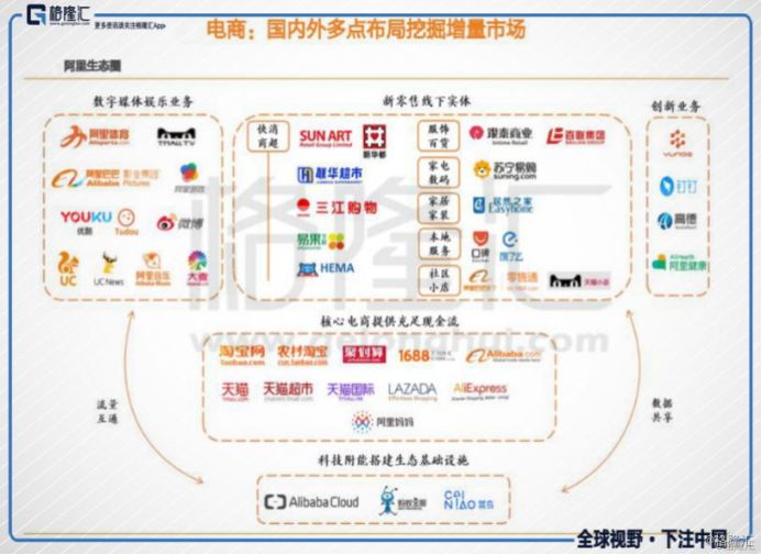 阿里所有的生意,都是围绕消费者和商家的商业互联网化,只是场景不停在拓宽——从实物电商到数字电商(大文娱)、再到线下新零售,再到本地生活服务;同时配套了建设了更底层的基础设施——金融、云计算、物流网络和配送系统,由此形成了完整立体的闭环。