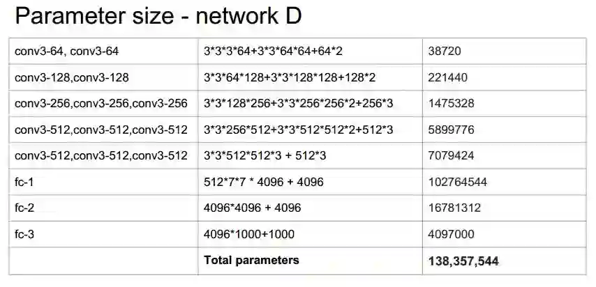 虽然VGG网络使用的均是3X3的卷积filter,极大的减小了参数个数,但和AlexNet比较起来,参数个数还是相当的多,以模型D为例,每一层的参数个数如下表所示,总参数个数为1.3亿左右,庞大的参数增加了训练的时间,下一章单搭建的VGG19模型仅在CPU上进行训练,单单一个epoch就要训练8小时以上!