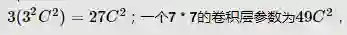 4、多个3 * 3的卷积层比一个大尺寸的filter有更少的参数,假设卷基层的输入和输出的特征图大小相同为C,那么三个3 * 3的卷积层参数个数为