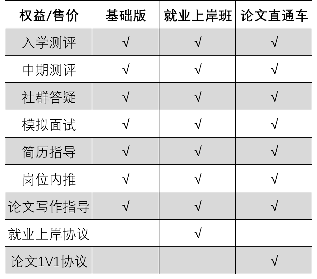 CV工业项目班分为基础版、就业上岸班和论文直通车3种版本。同学们可以根据自己的实际需求选择对应的服务。