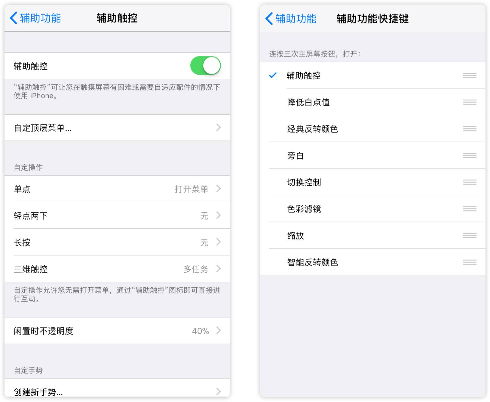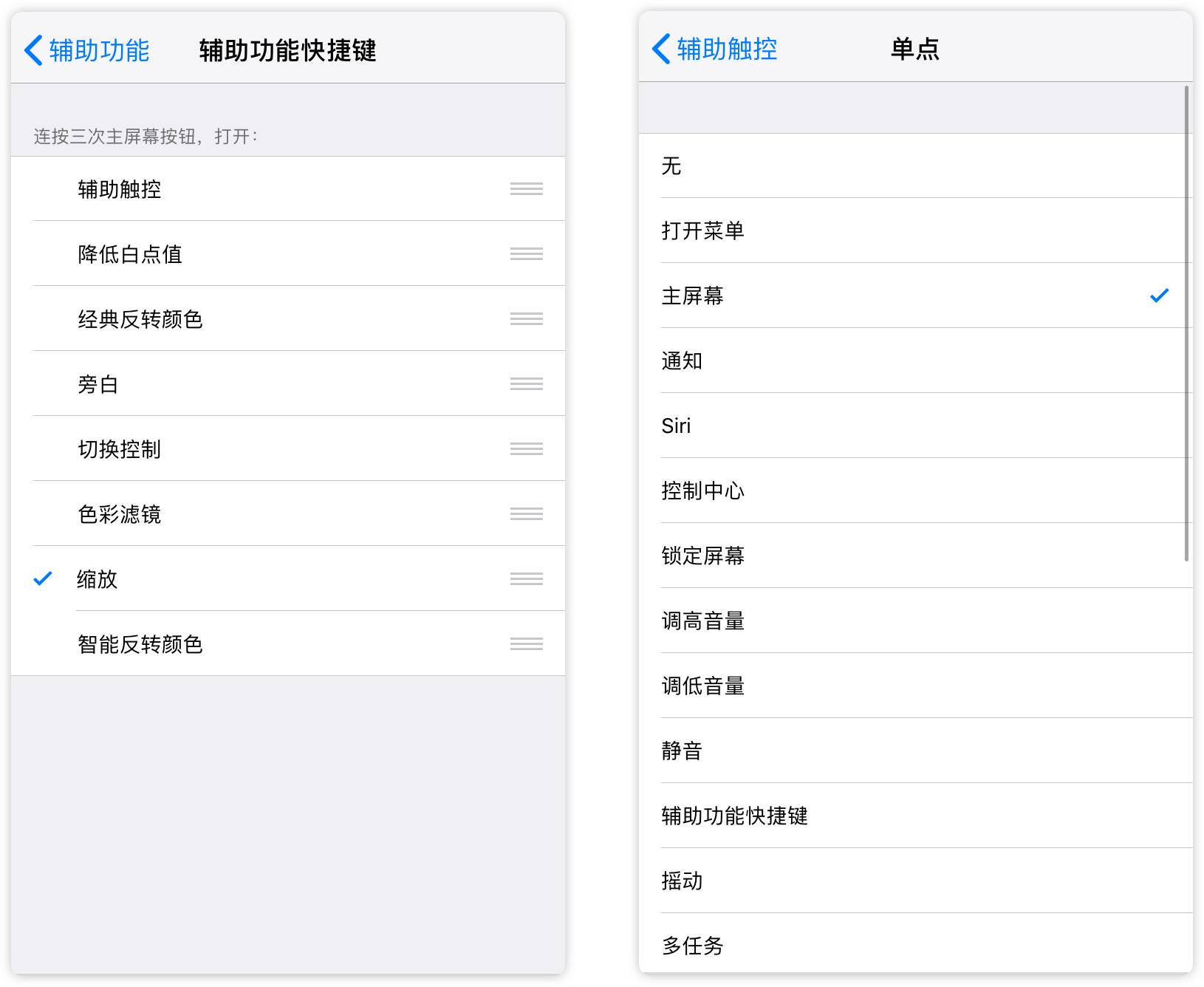 完成后,再利用小白点的单点中自定义功能选择「主屏幕」,并且在「设置 - 通用 - 辅助功能 - 辅助功能快捷键」里选择连按三次打开缩放,就可以通过三次点击小白点来瞬间最低亮度。