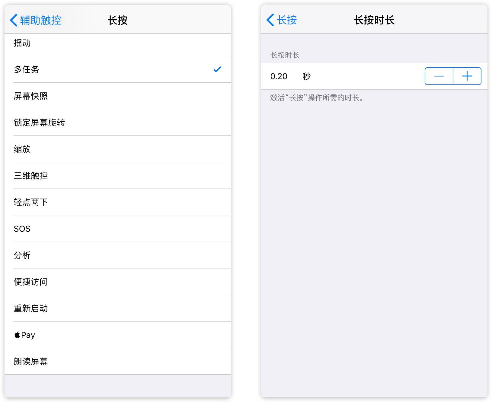 我们需要做的只是利用了小白点的设置选项而已,打开「设置 - 通用 - 辅助功能 - 辅助触控 - 长按」里勾选多任务即可。现在把你的手指放在小白点上,等待一秒就会进入多任务模式。你也可以用点力气按下去,假装自己有 3D Touch 一样。这里提一点,在长按中你可以自由设定长按激活的时长,时间越短给你的感觉就会越灵敏。
