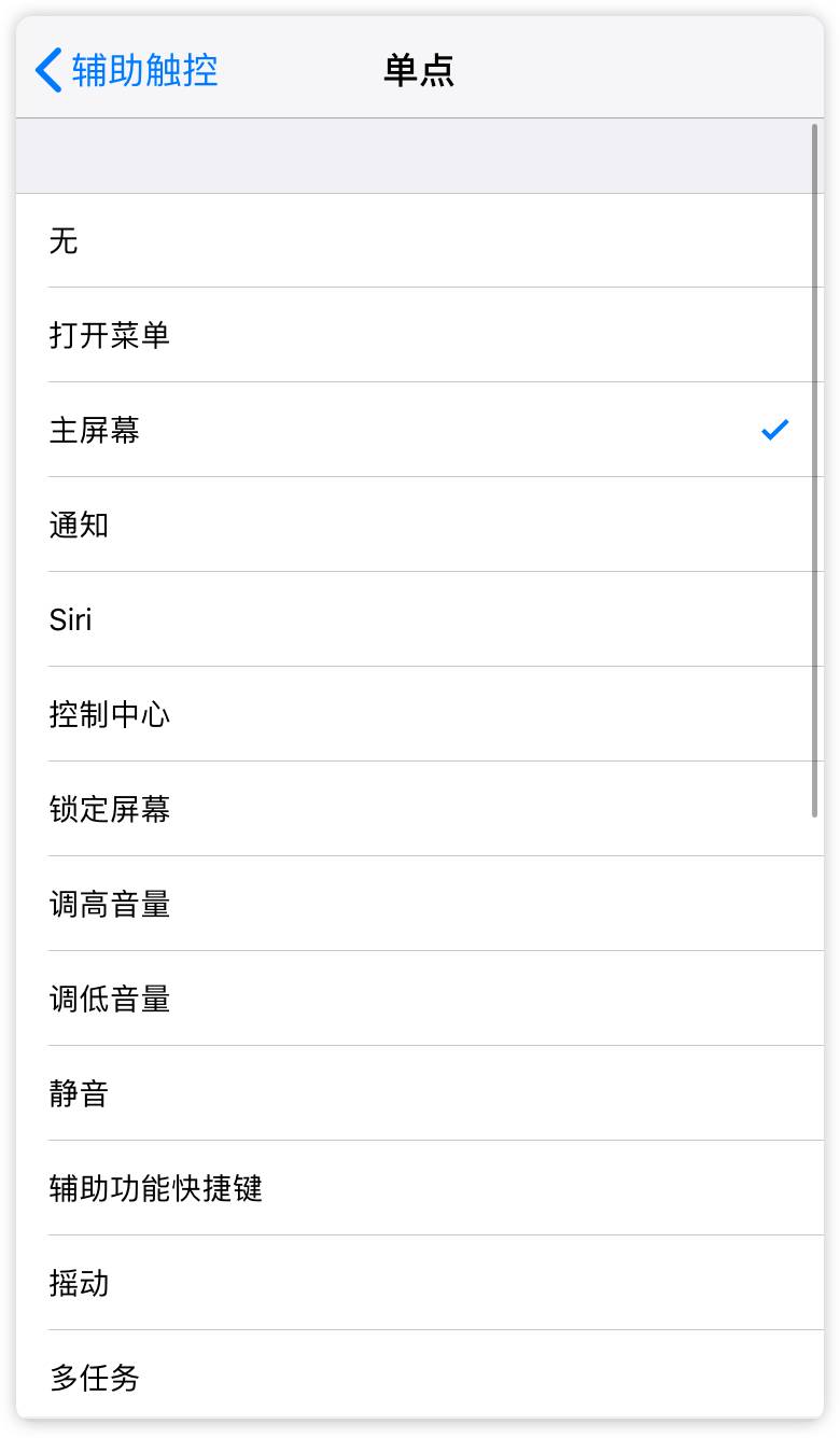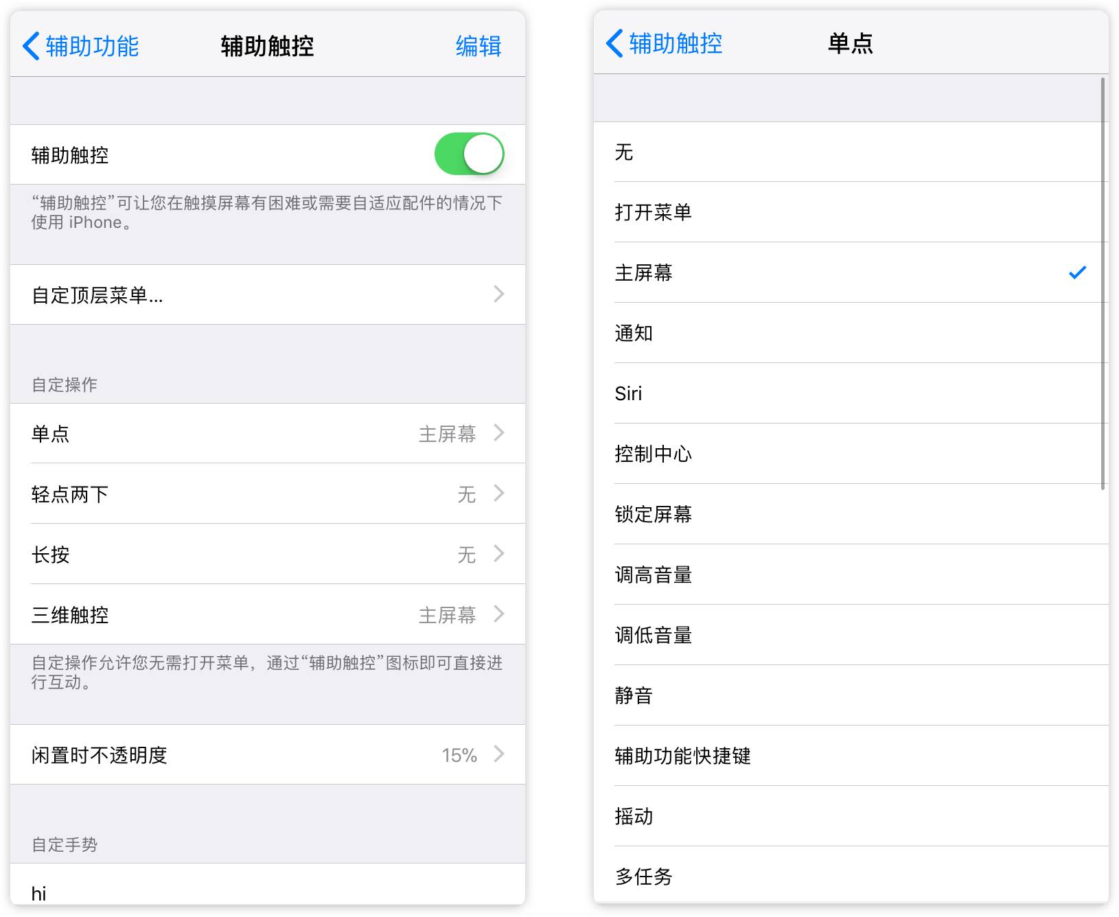 上一部分说到,单点小白点也是一个操作,其实通过直接点击小白点回到主屏或许更快。当你在用大拇指滑动浏览屏幕的时候,点击边缘的小白点或许比移动至 Home 键更快,尤其是使用 Plus 设备。这里我们就只需要在单点中自定义功能选择「主屏幕」即可。