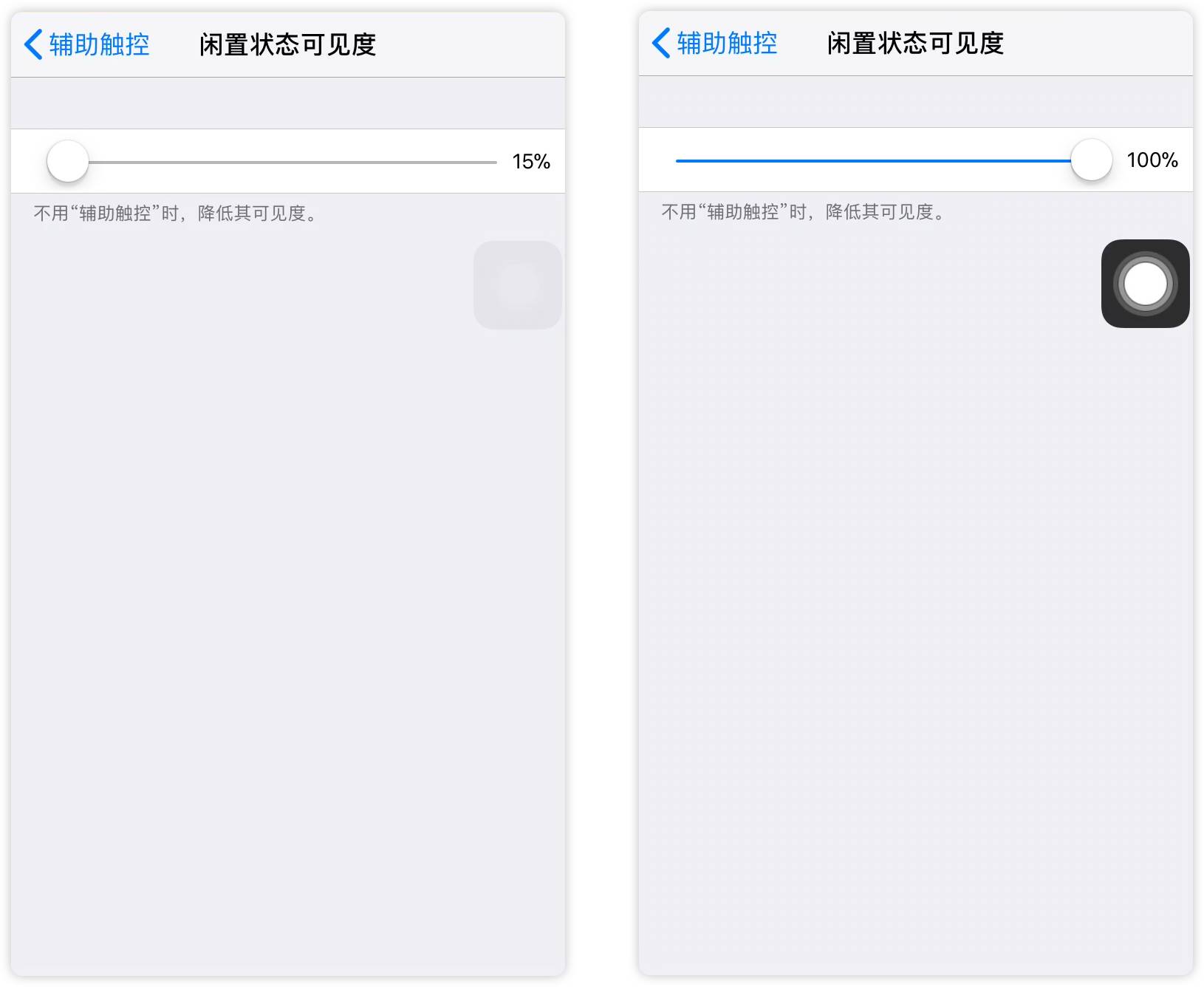 有的人不使用小白点,可能是因为觉得屏幕上有一块区域被遮挡觉得心里很不舒服,其实小白点也可以隐形的。细心的人可能会发现,当时一段时间不点击小白点的时候,它是会「变色」的,准确的说应该是改变了透明度。在设置里,其实就有一项「闲置状态可见度」,你可以在里面把可见度调节到最低,这样你的小白点就几乎是看不到了!