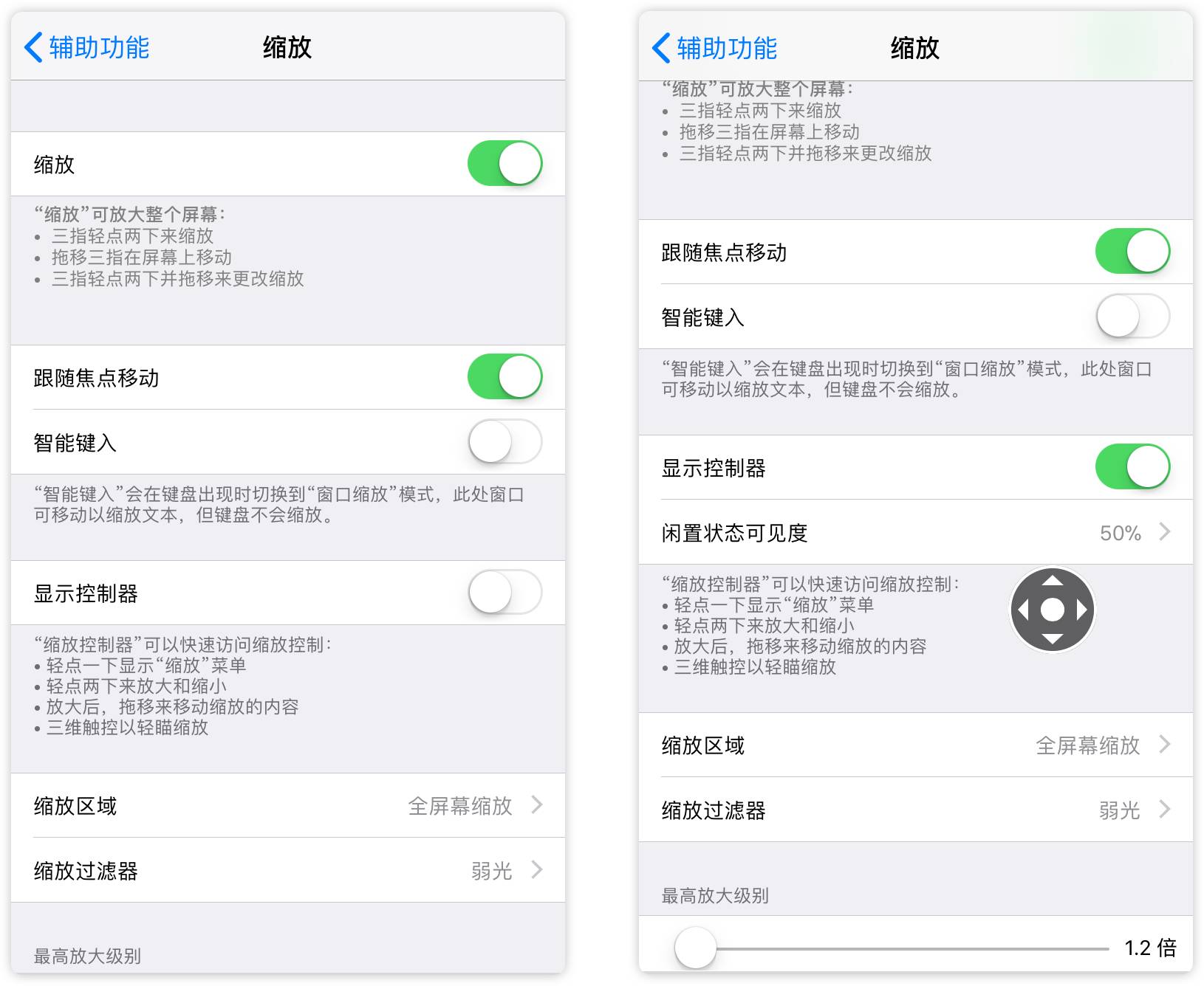 完成后打开「缩放」的开关,你会发现界面被放大了,同时在屏幕中还出现了一个遥感按钮就是现实控制器。双击遥感,界面大小就会恢复正常,再关闭显示控制器的按钮即可保持亮度。