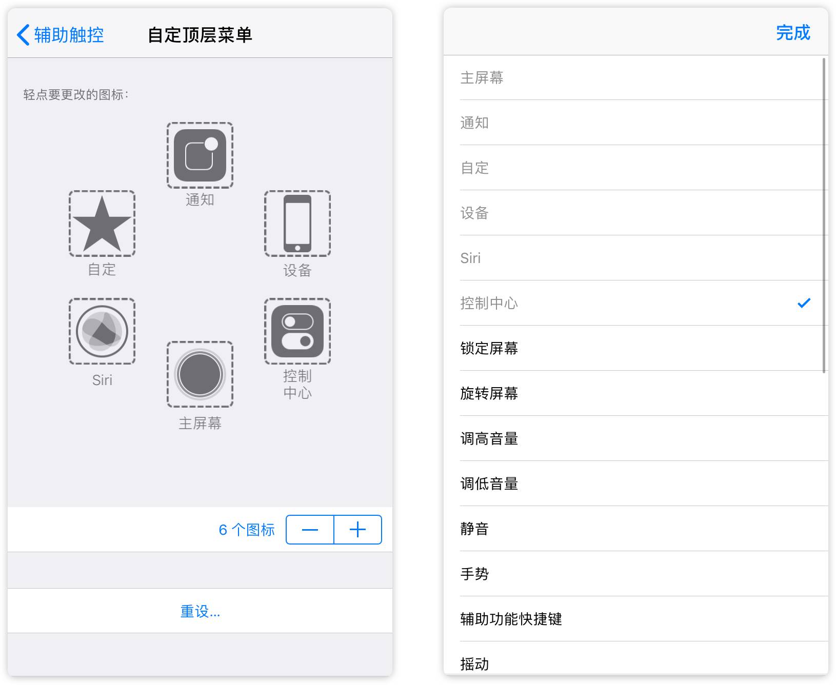 在顶层菜单里,iOS 为我们默认了六种功能,但它们并不是根据你的使用频率来的。所以你可以在设置里,根据自己的喜好设置前文的操作,不需要进入多层级就可以点击了。顶层菜单的功能数量在这里其实也可以调节的,最少有一个功能,最多有八个。如果你使用一个功能的话,我建议可以不用顶层菜单了。