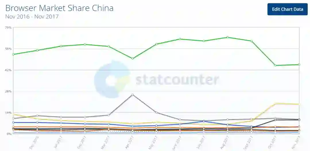 据市场研究公司Net Applications的报告,2017年微软的“老古董”IE和Edge两款浏览器在中国市场下滑厉害,Mozilla公司的火狐浏览器也有下跌,而这几家失去的份额几乎都被谷歌Chrome吃掉。