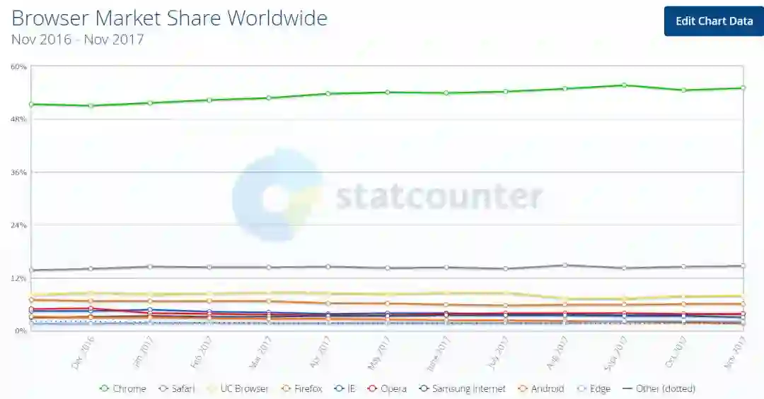 根据统计网站StatCounter的最新数据,截至2017年12月,谷歌的Chrome浏览器俘获了全球一半以上的手机和电脑用户,市场份额高达55.08%;而中国的UC浏览器排在苹果Safari之后位列第三,占全球市场份额的8.67%。