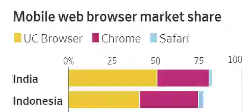 但根据StatCounter统计,在印度市场,UC浏览器的市场占有率达到51%,谷歌Chrome只有30%;在印尼,UC也以41%对32%在市场份额上胜过谷歌。
