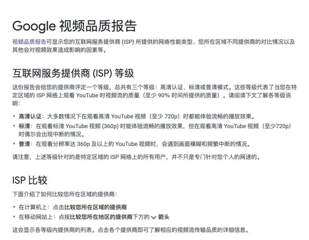 为了进一步“恐吓”运营商,Google 从 2014 年开始对 ISP 服务进行评级,这个工具其实就是“测测你家网访问 YouTube 如何”——如果你的测试结果不佳,YouTube 会向你详细的科普一下这主要是运营商的锅,并且建议你换个支持 Google Peering 的宽带。