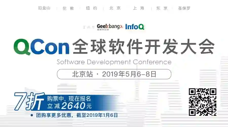 2019 年 5 月 6-8 日北京国际会议中心,QCon 与您相约获得启发,共同关注行业趋势与工程实践。点击 「阅读原文」 或识别二维码了解 QCon 十周年精心策划,早鸟 7 折立减 2640 元,有任何问题欢迎联系票务小姐姐 Ring:电话 010-53935761,微信 qcon-0410