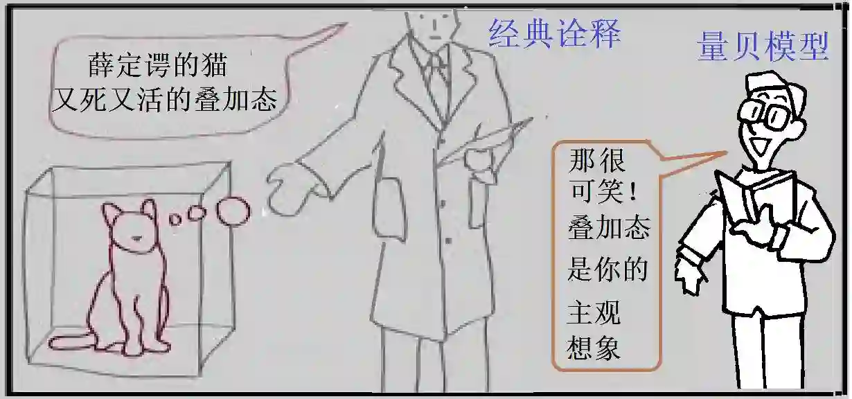 根据量贝模型,盒子里的“薛定谔猫”并没有处于什么“既死又活”的恐怖状态。但盒子外的观察者对里面的“猫态”认识不够,不足以准确确定它的“死活”,便主观想象它处于一种死活二者并存的叠加态,并使用波函数的数学工具来描述和更新观察者自己的这种主观信念。