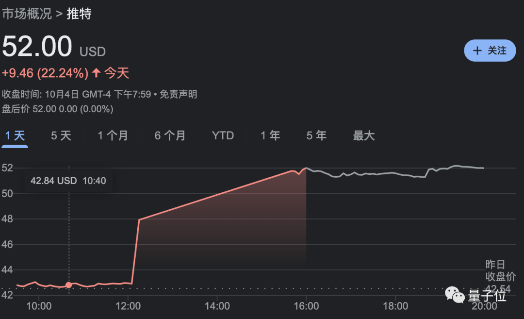 消息一出推特股价暴涨停盘,涨幅超22%;特斯拉股价也一度上涨6%,收盘涨幅近3%。