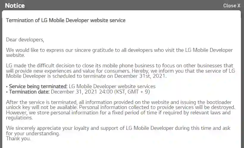 LG 日前发出通知,将于韩国时间 12 月 31 日 0 点关闭 LG 移动开发者网站,届时,网站存储的所有信息以及 bootloader 解锁服务将不再可用。换言之,如果你没有在此之前申请官解 bootloader 锁的话,今后刷机将非常棘手。虽然对于 LG G8、G8S、G8X 和 V50 ThinQ 可以使用三方工具以及高通的救砖工具,可其对于小白用户来说并不友好。此外,该通知进一步指出,为提供服务而收集的所有个人信息都将被销毁。但是,根据相关法律法规的要求,LG 可能会将某些个人信息存储一段时间。